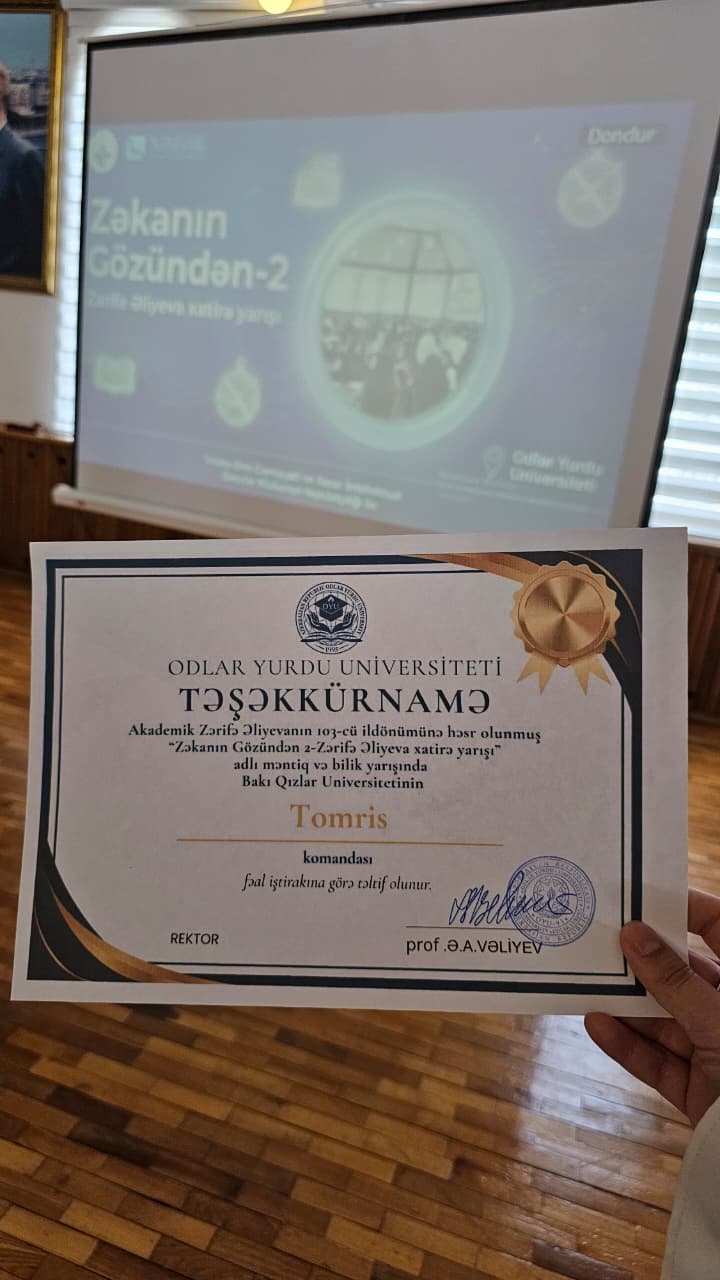 Universitetimizi “Tomris” komandası təmsil edib. Komanda yarışda fəallığı ilə seçilərək ali təhsil müəssisəmizi layiqincə təmsil edib və yüksək intellektual hazırlıq nümayiş etdirib.
